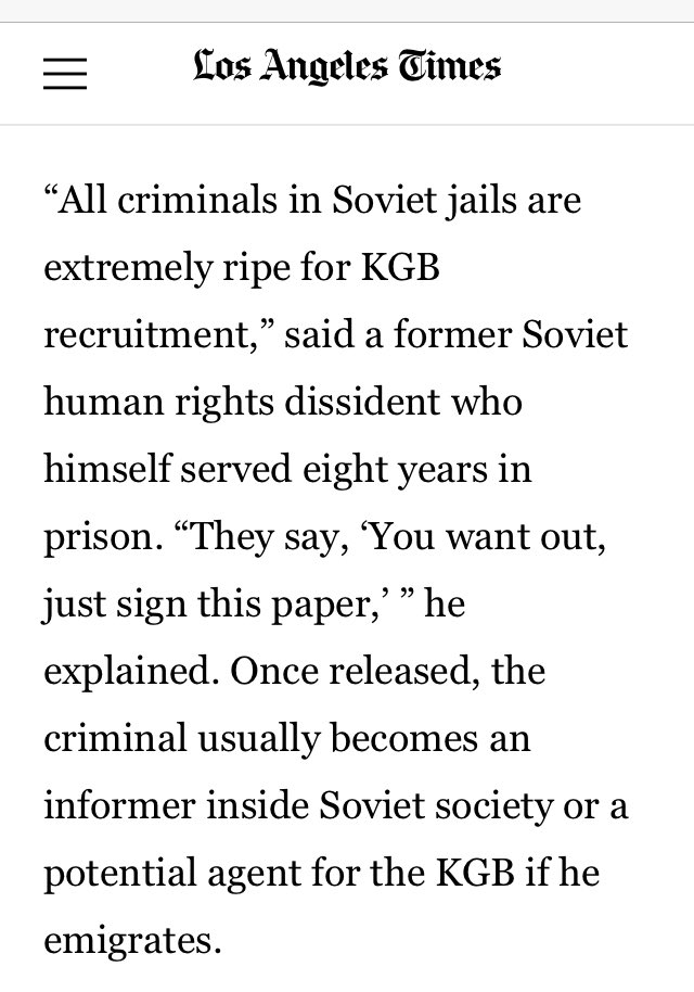 “All criminals in Soviet jails are extremely ripe for KGB recruitment,” said a former Soviet human rights dissident who himself served eight years in prison. “They say, ‘You want out, just sign this paper,’ ” he explained.