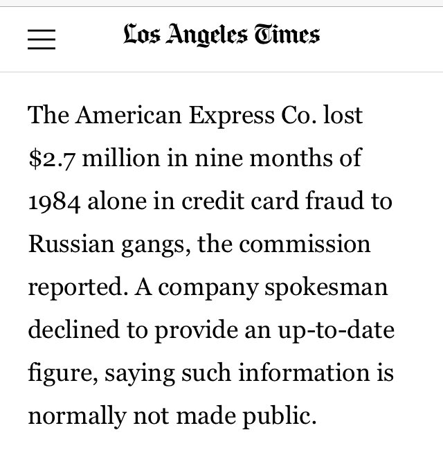 The American Express Co. lost $2.7 million in nine months of 1984 alone in credit card fraud to Russian gangs, the commission reported. A company spokesman declined to provide an up-to-date figure, saying such information is normally not made public.