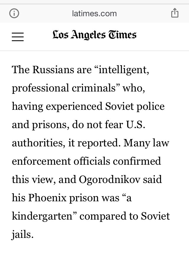 The Russians are “intelligent, professional criminals” who, having experienced Soviet police & prisons, do not fear U.S. authorities, it reported. Many law enforcement officials confirmed this view; Ogorodnikov said his Phoenix prison was “a kindergarten” compared to Soviet jails