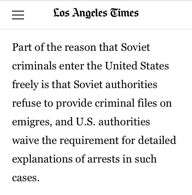 Part of the reason that Soviet criminals enter the United States freely is that Soviet authorities refuse to provide criminal files on emigres, and U.S. authorities waive the requirement for detailed explanations of arrests in such cases.
