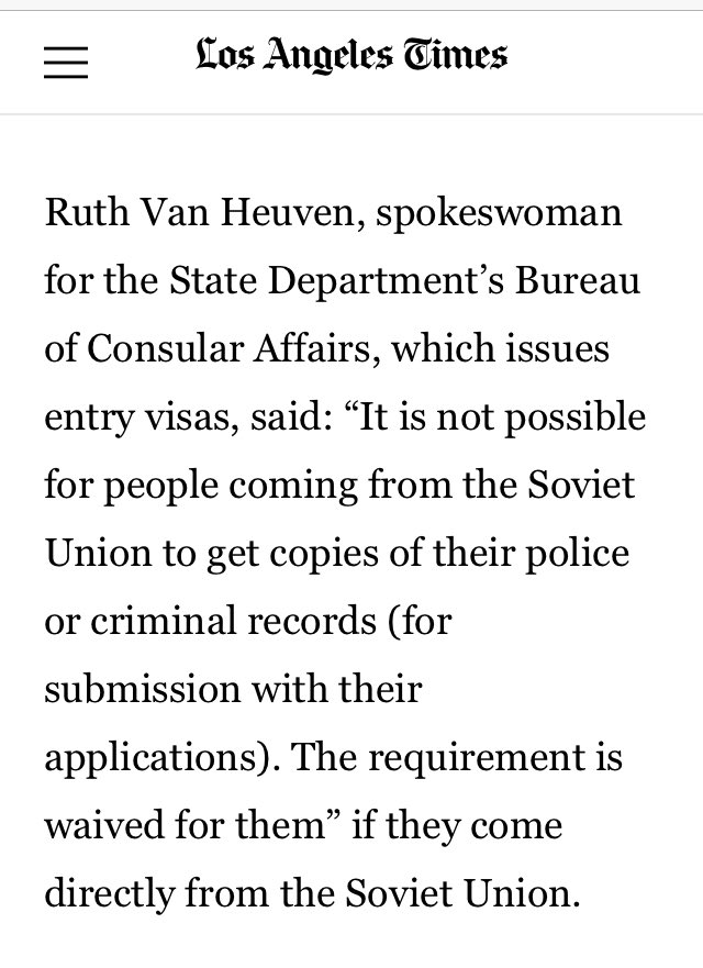 Ruth Van Heuven, with the State Dept’s Bureau of Consular Affairs, said: “It is not possible for people coming from the Soviet Union to get copies of their police or criminal records. The requirement is waived for them” if they come directly from the Soviet Union.