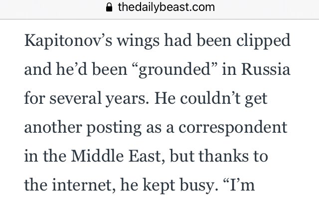 It was the late 2000s. Kapitonov’s wings had been clipped and he’d been “grounded” in Russia for several years. He couldn’t get another posting as a correspondent in the Middle East, but thanks to the internet, he kept busy.