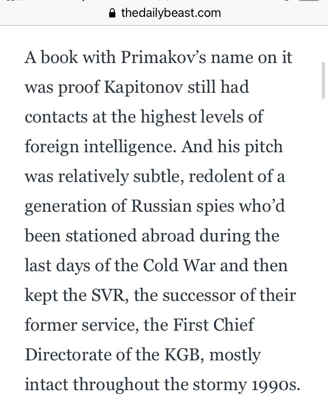 …his pitch was relatively subtle, redolent of a generation of Russian spies who’d been stationed abroad during the last days of the Cold War and then kept the SVR, the successor of their former service, the First Chief Directorate of the KGB, mostly intact throughout the 1990s.