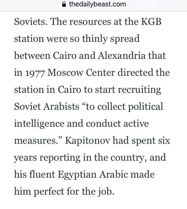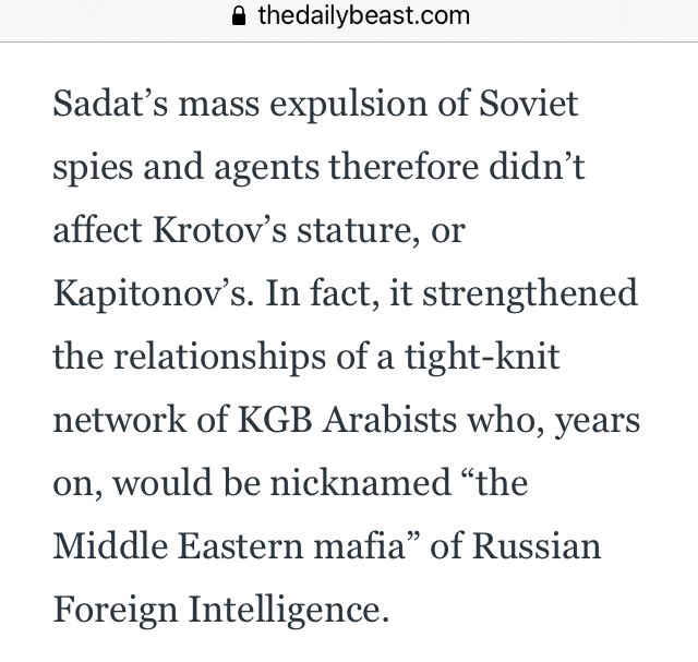 Thus Sadat’s mass expulsion of Soviet spies & agents didn’t affect Krotov’s stature, or Kapitonov’s. In fact, it strengthened the relationships of a tight-knit network of KGB Arabists who, years on, would be nicknamed “the Middle Eastern mafia” of Russian Foreign Intelligence.