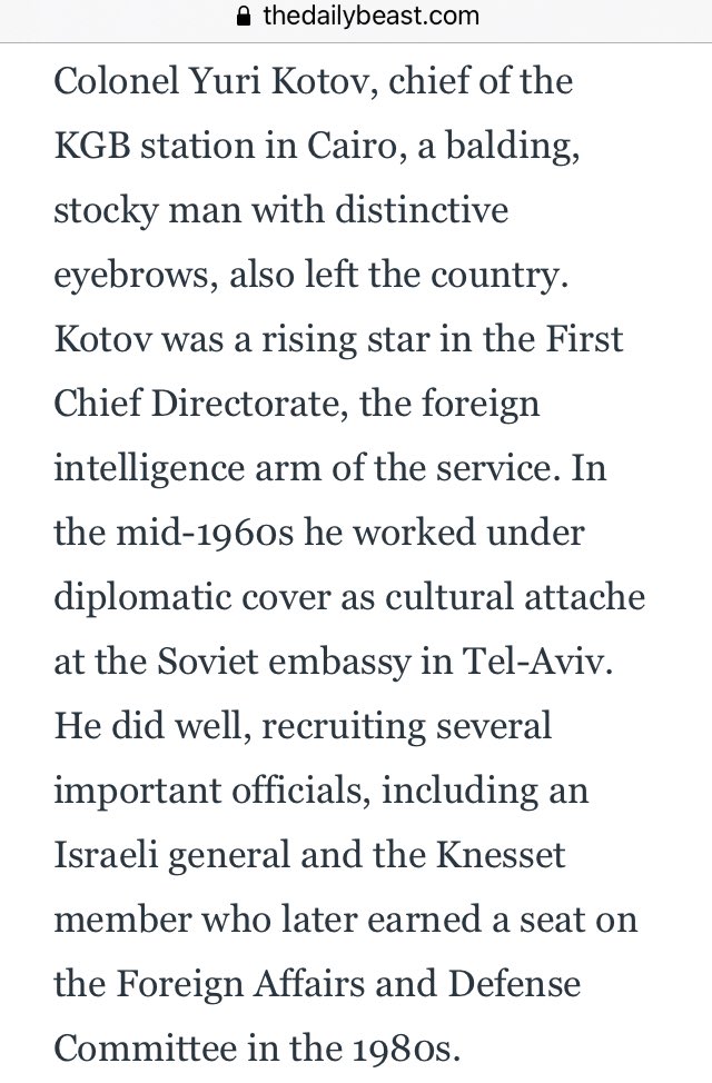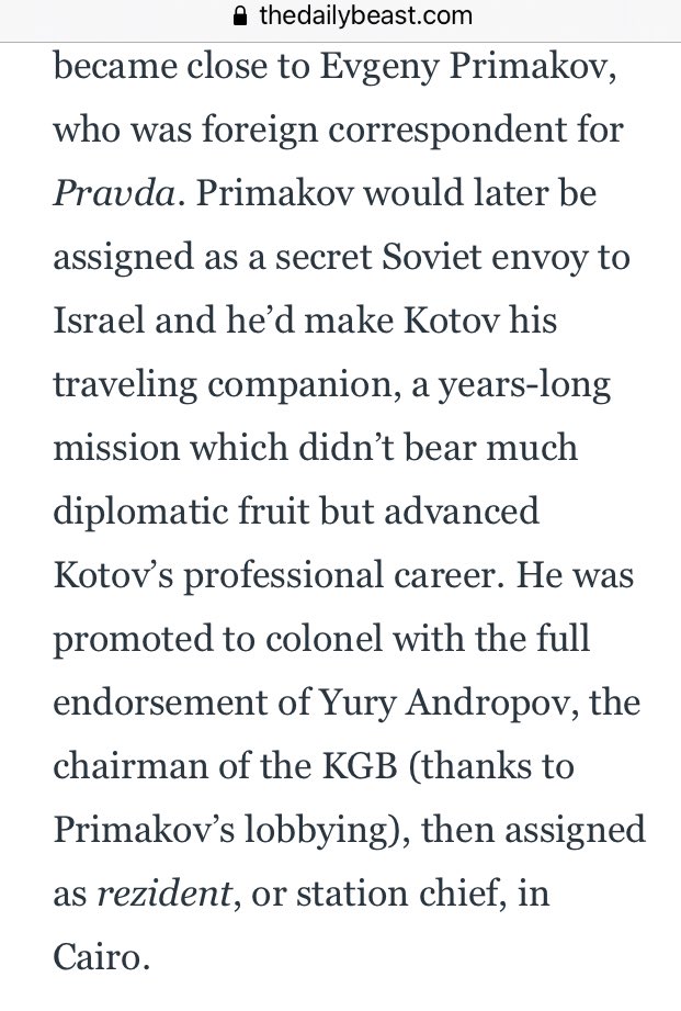 Primakov was assigned as secret Soviet envoy to Israel & he made Kotov his traveling companion, a mission which didn’t bear much fruit but advanced Kotov’s career. He was promoted to colonel with the endorsement of KGB chairman Yury Andropov, then assigned station chief, in Cairo