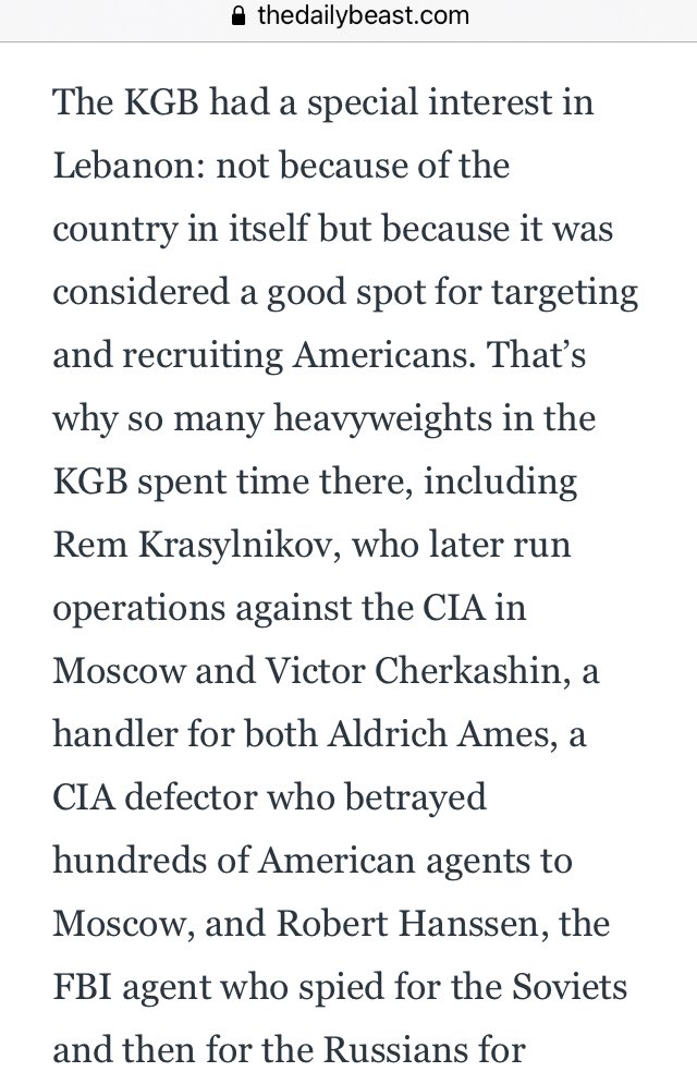 …and Victor Cherkashin, a handler for both Aldrich Ames, a CIA defector who betrayed hundreds of American agents to Moscow, and Robert Hanssen, the FBI agent who spied for the Soviets and then for the Russians for decades. Another bigwig in Beirut was Kotov.