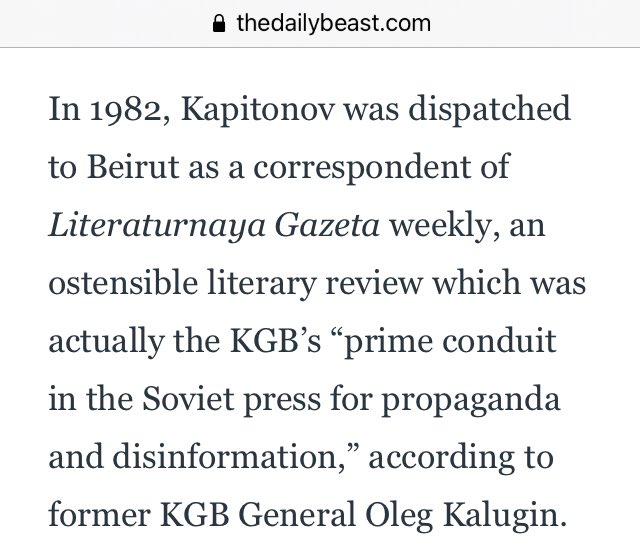 In 1982, Kapitonov was dispatched to Beirut as a correspondent of Literaturnaya Gazeta weekly, an ostensible literary review which was actually the KGB’s “prime conduit in the Soviet press for propaganda and disinformation,” according to former KGB General Oleg Kalugin.