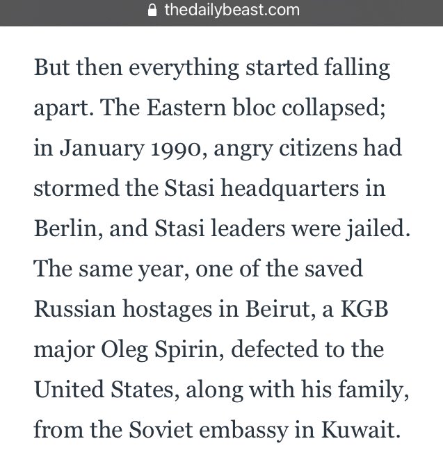 But then everything started falling apart. The Eastern bloc collapsed; in Jan 1990, angry citizens stormed the Stasi headquarters in Berlin, and Stasi leaders were jailed. The same year, one of the saved Russian hostages in Beirut, a KGB major Oleg Spirin, defected to the U.S.