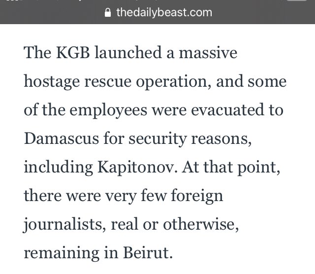 The KGB launched a massive hostage rescue operation, and some of the employees were evacuated to Damascus for security reasons, including Kapitonov. At that point, there were very few foreign journalists, real or otherwise, remaining in Beirut.