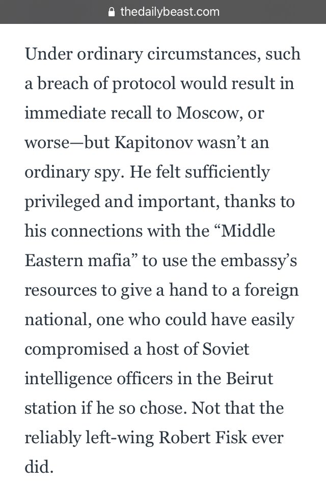 He felt sufficiently privileged & important, thanks to his connections with the “Middle Eastern mafia”, to use the embassy’s resources to give a hand to a foreign national, one who could have easily compromised a host of Soviet intelligence officers in the Beirut station…