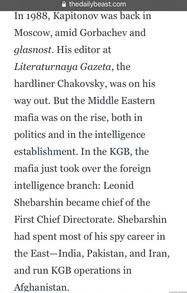 By 1988, Kapitonov was back in Moscow, amid Gorbachev and glasnost. His editor at Literaturnaya Gazeta, the hardliner Chakovsky, was on his way out. But the Middle Eastern mafia was on the rise, both in politics and in the intelligence establishment.