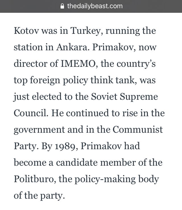 Kotov was in Turkey, running the station in Ankara. Primakov, now director of IMEMO, the country’s top foreign policy think tank, was just elected to the Soviet Supreme Council. He continued to rise in the government and in the Communist Party.