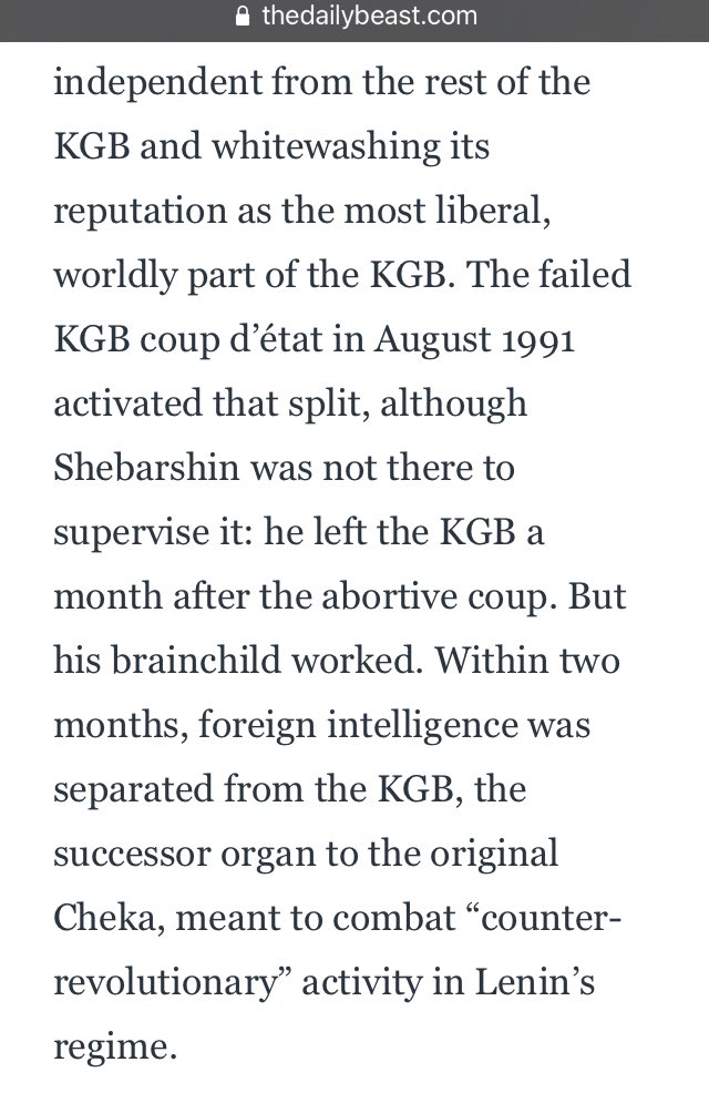 The failed KGB coup d’état in August 1991 activated that split, although Shebarshin was not there to supervise it: he left the KGB a month after the abortive coup.
