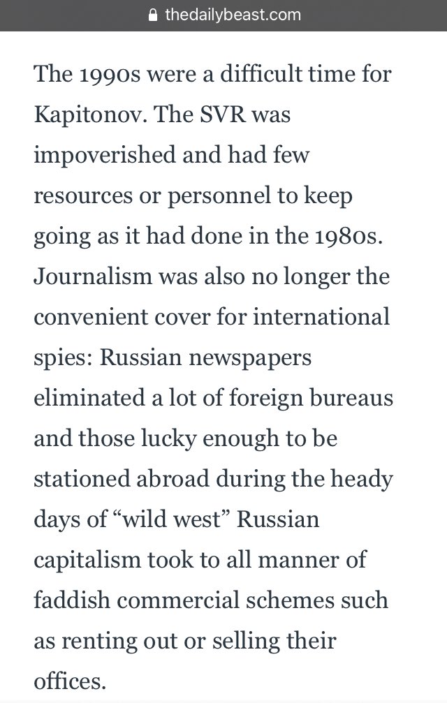 Journalism was also no longer the convenient cover for international spies: Russian newspapers eliminated a lot of foreign bureaus, and those lucky enough to be stationed abroad resorted to all manner of faddish commercial schemes such as renting out or selling their offices.