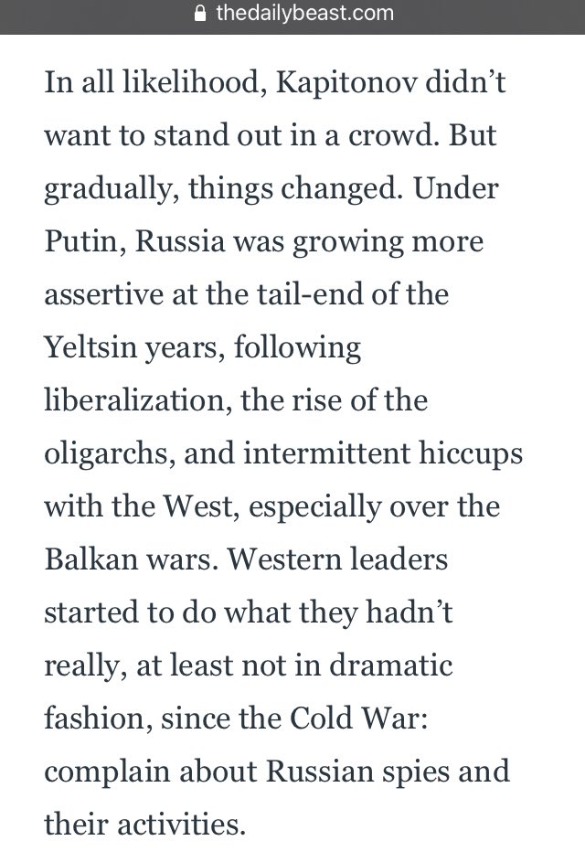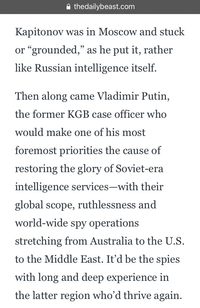 Then along came Vladimir Putin, a former KGB case officer who would make one of his foremost priorities to restore the glory of Soviet-era intelligence services, with their global scope, ruthlessness, & worldwide operations stretching from Australia to the U.S. to the Middle East