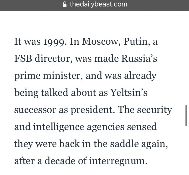 It was 1999. In Moscow, Putin, a FSB director, was made Russia’s prime minister, and was already being talked about as Yeltsin’s successor as president. The security and intelligence agencies sensed they were back in the saddle again, after a decade of interregnum.