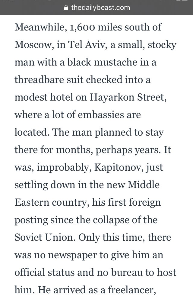 In the Soviet bureaucracy, expulsion from the West was never considered an auspicious start of one’s career, either for a journalist or a spy. But the Middle East was a different story, particularly if you’d played your cards right, & Kapitonov had.