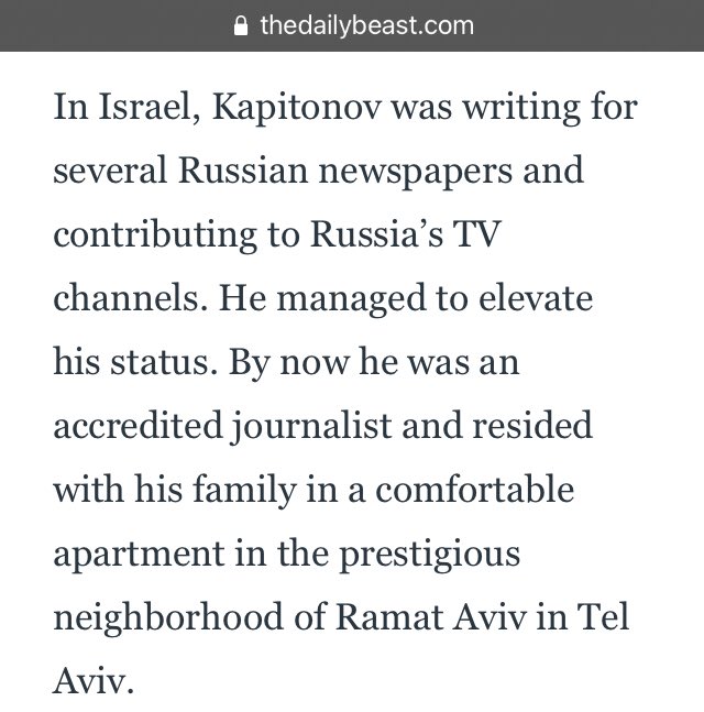 In Israel, Kapitonov was writing for several Russian newspapers & contributing to Russia’s TV channels. He managed to elevate his status; he was an accredited journalist and resided with his family in a comfortable apartment in the prestigious Tel Aviv neighborhood of Ramat Aviv.