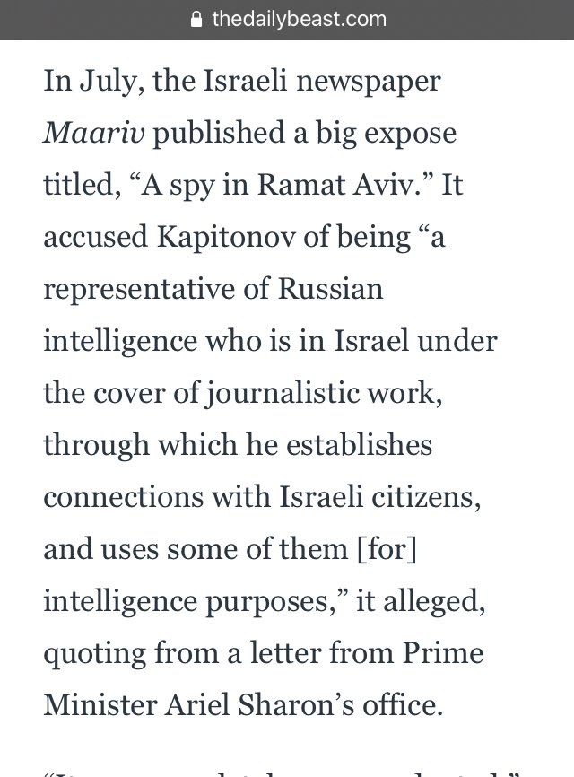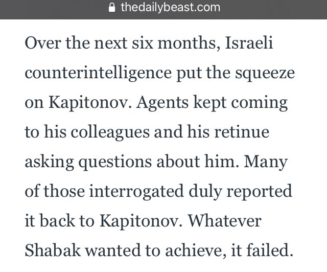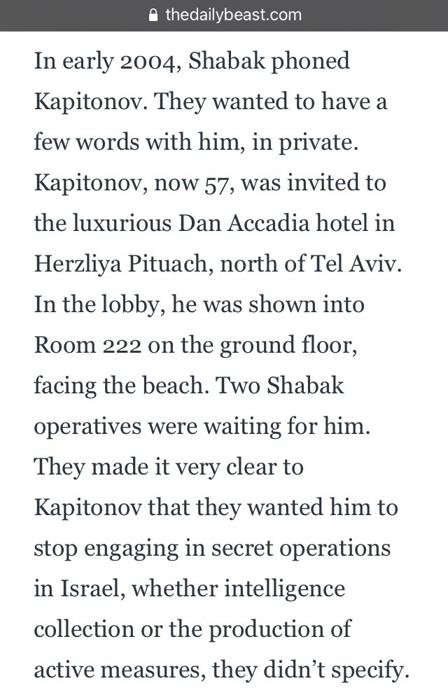 In early 2004, Israeli counterintelligence Shabak phoned Kapitonov & arranged a private meeting. They made it very clear that they wanted him to stop engaging in secret operations in Israel, whether intelligence collection or the production of active measures, they didn’t specify