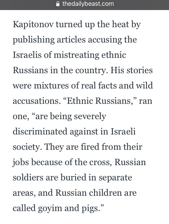Kapitonov turned up the heat by publishing articles accusing the Israelis of mistreating ethnic Russians in the country. His stories were mixtures of real facts and wild accusations.