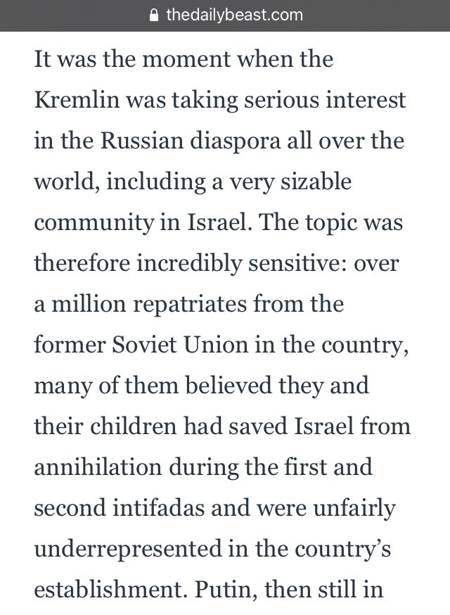 It was the moment when the Kremlin was taking serious interest in the Russian diaspora all over the world, including a very sizable community in Israel.