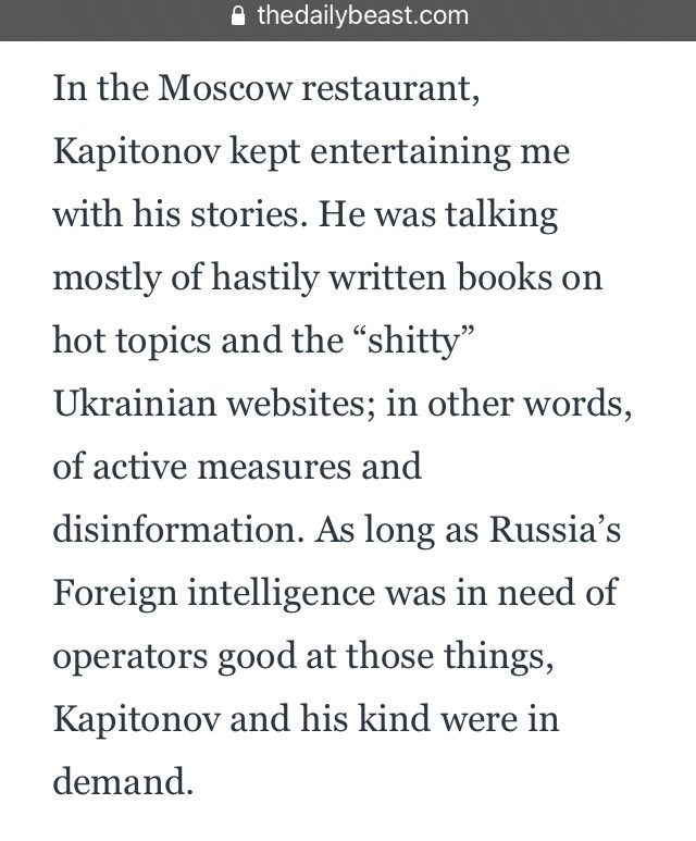 In the Moscow restaurant, Kapitonov kept entertaining me with his stories. He was talking mostly of hastily written books on hot topics and the “shitty” Ukrainian websites; in other words, of active measures and disinformation.