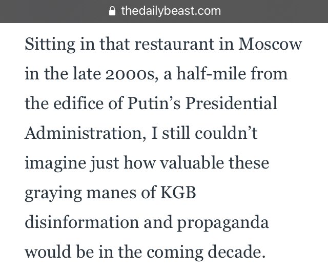 Sitting in that restaurant in Moscow in the late 2000s, a half-mile from the edifice of Putin’s Presidential Administration, I still couldn’t imagine just how valuable these graying manes of KGB disinformation and propaganda would be in the coming decade.