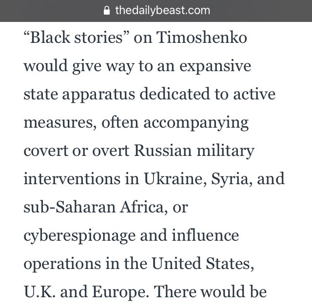 “Black stories” on Timoshenko would give way to a state apparatus dedicated to active measures, often accompanying covert or overt Russian military interventions in Ukraine, Syria, & sub-Saharan Africa, or cyberespionage & influence operations in the United States, U.K. & Europe.