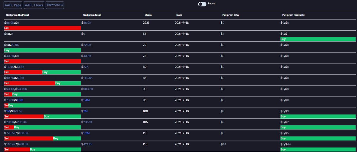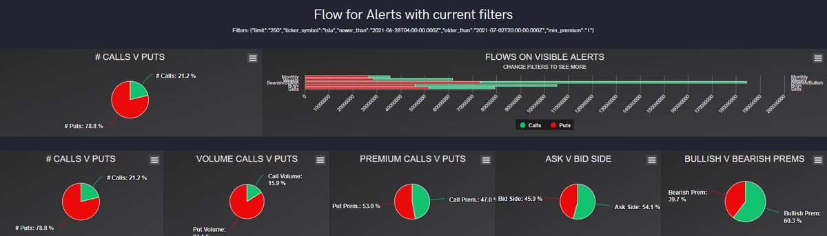 Flow: (1) The options flow feed (2) You can see the full range of transactions from any one date of your choosing, as well as filter in/out other variables (3) View the flow charts (4) View the breakdown by expiration and strike charts