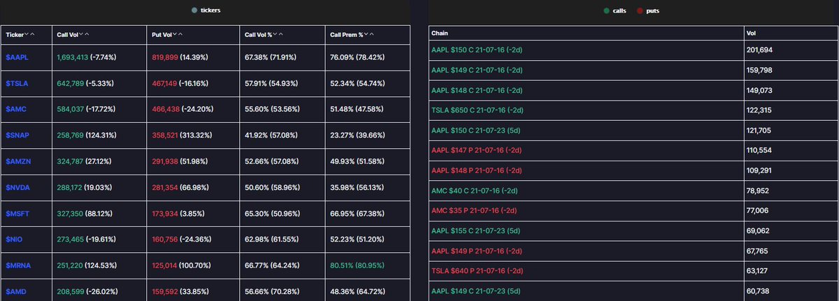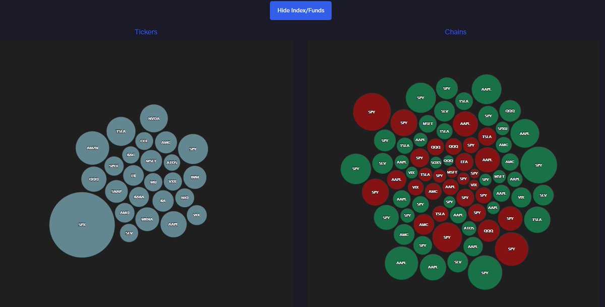Hot Chains and Tickers: (1) Heatmaps displaying tickers with the size of the bubble relative to the amount of premium traded on the ticker and tickers with the size of the bubble relative to the amount of premium traded on that specific chain (2) Additional volume/premium metrics