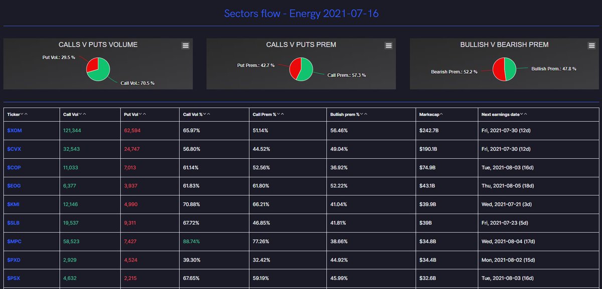 Sector Flow (1) Volume and premium metrics specific to sector (2) Select a sector to see the flow for applicable tickers
