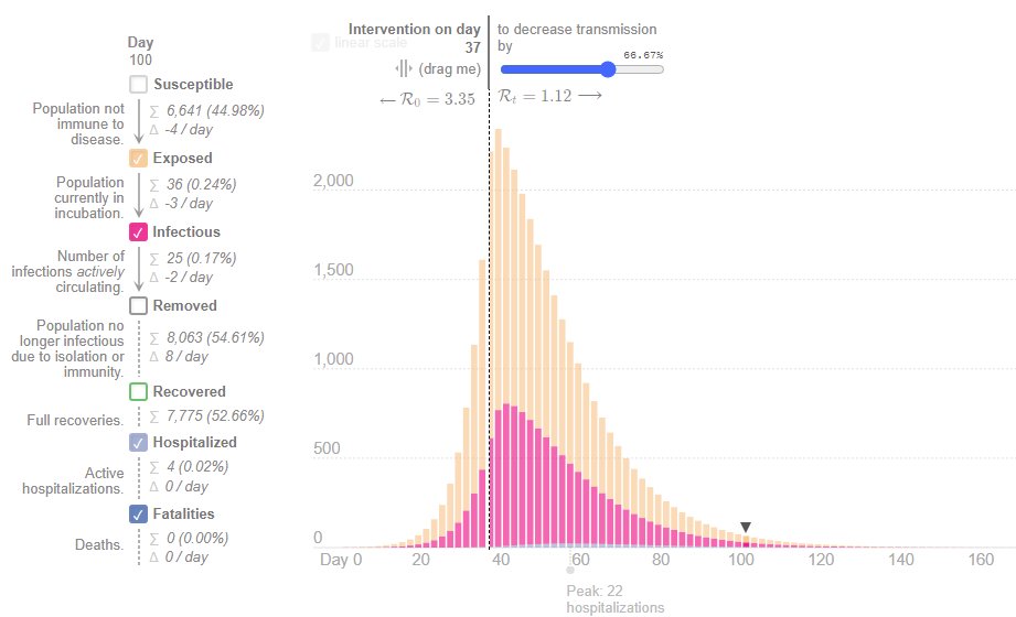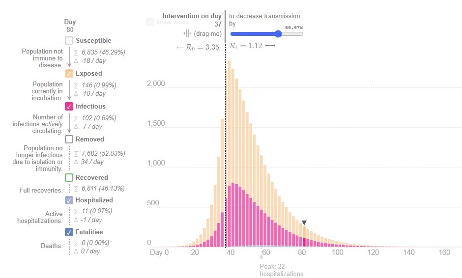 The above SEIR model assumes that one COVID+ seeder was introduced into the community and the natural wave was allowed to take its natural course. Known possible ground zero was reported case at CRHS 20 days ago. (16/n)