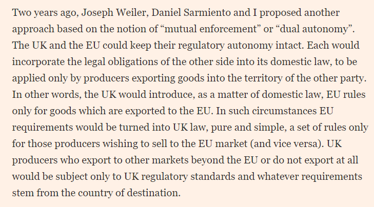 In brief, the idea is that the entire EU regulatory acquis for goods is enshrined in UK law, and the entire UK equivalent into the EU. These would then apply only to goods exported to the other party. A nightmare-ish bureaucratic proposition at heart.