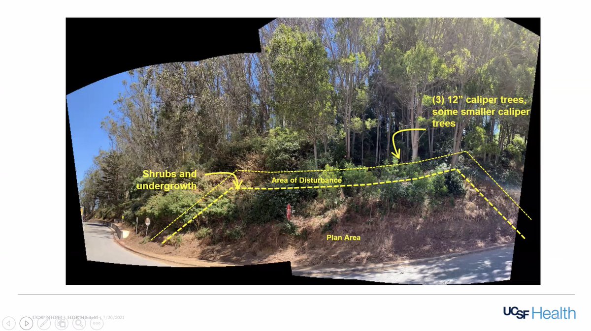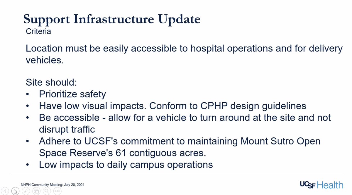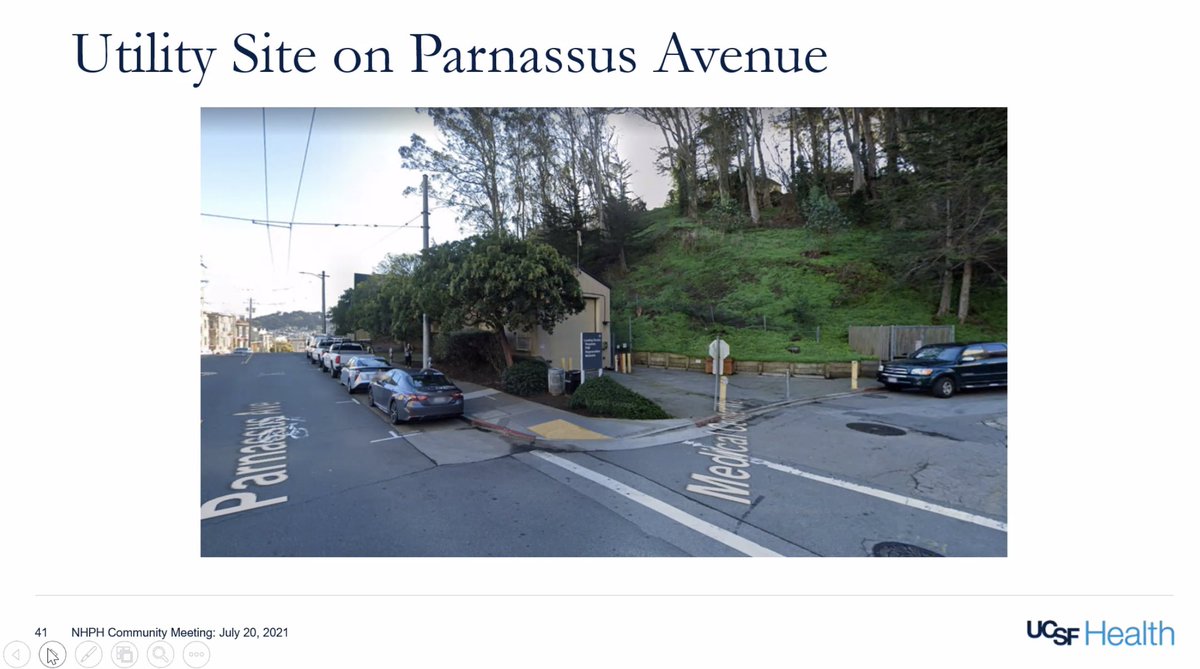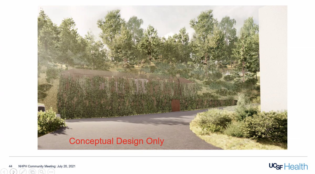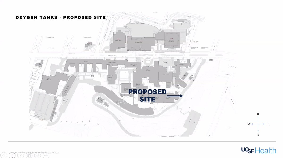 Whitney is handing the presentation to Jason Frantzen to talk about where to locate the bulk oxygen tanks, adjacent to the hospital. Initially they assumed a utility site on the corner of Medical Center Way and Parnassus Ave. They found it would have a visual impact on the street