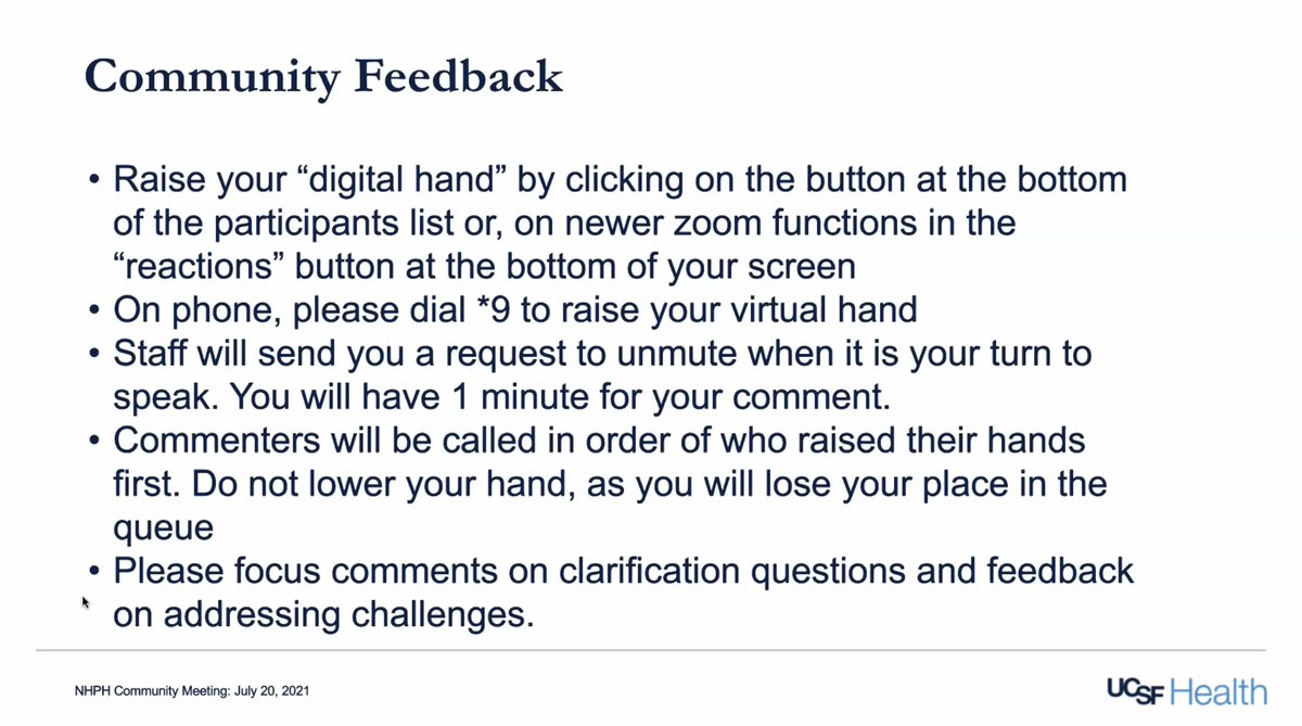 Frantzen is turning the meeting over to Lily Wong, Associate Director of Community Relations at UCSF, to moderate the community discussion