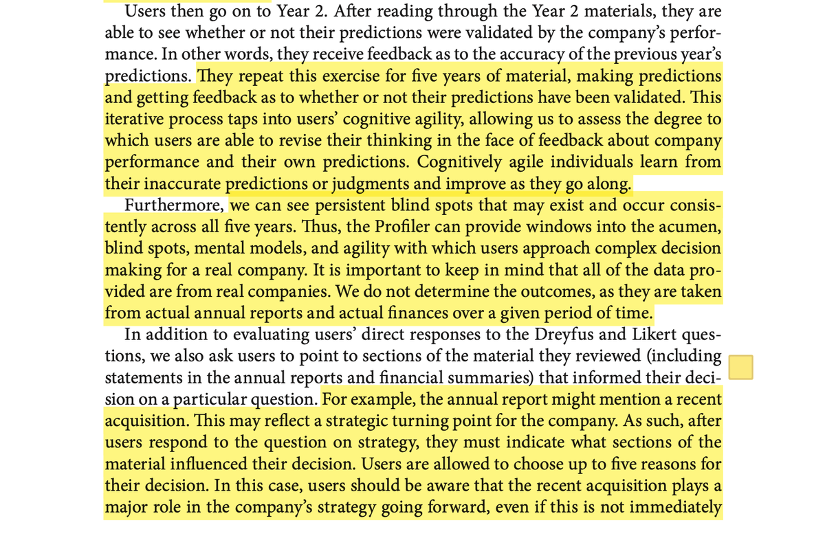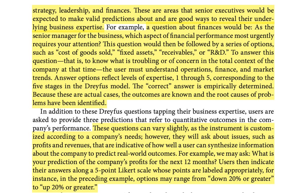 These questions are predictive of expertise because they map closely to real world decision-making these execs have to make.