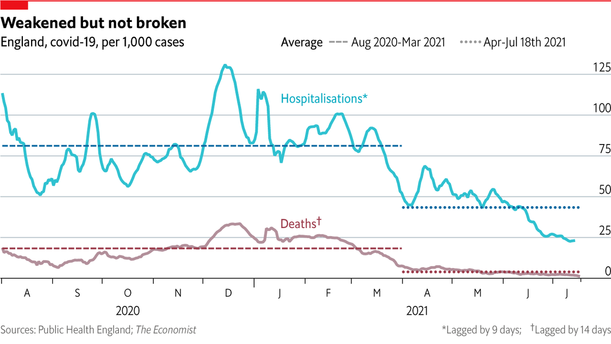 Analysis by The Economist finds that in recent months the link between covid-19 cases and subsequent hospitalisation and death in England has weakened—but not entirely broken econ.st/3zfvpmY