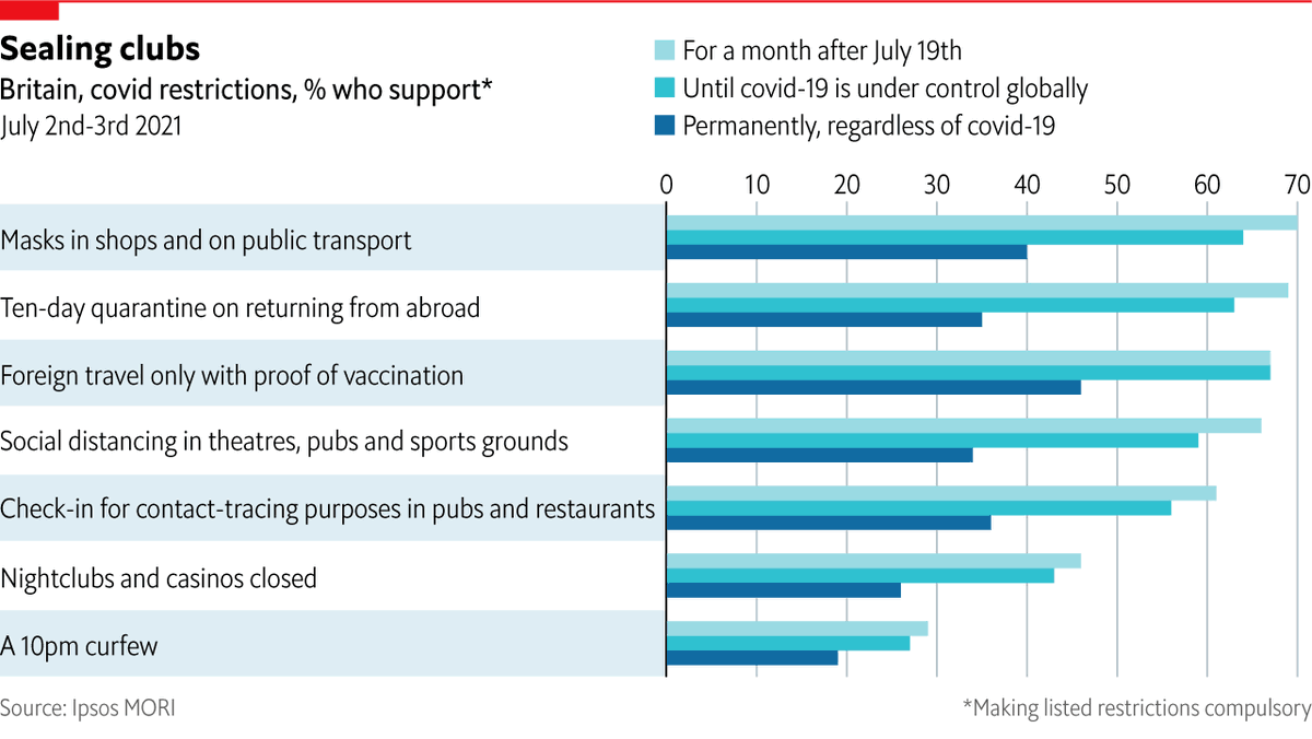 Polling by Ipsos MORI for The Economist suggests two-thirds of British people think masks, social distancing and travel restrictions should continue for another month econ.st/3kC5Rwt