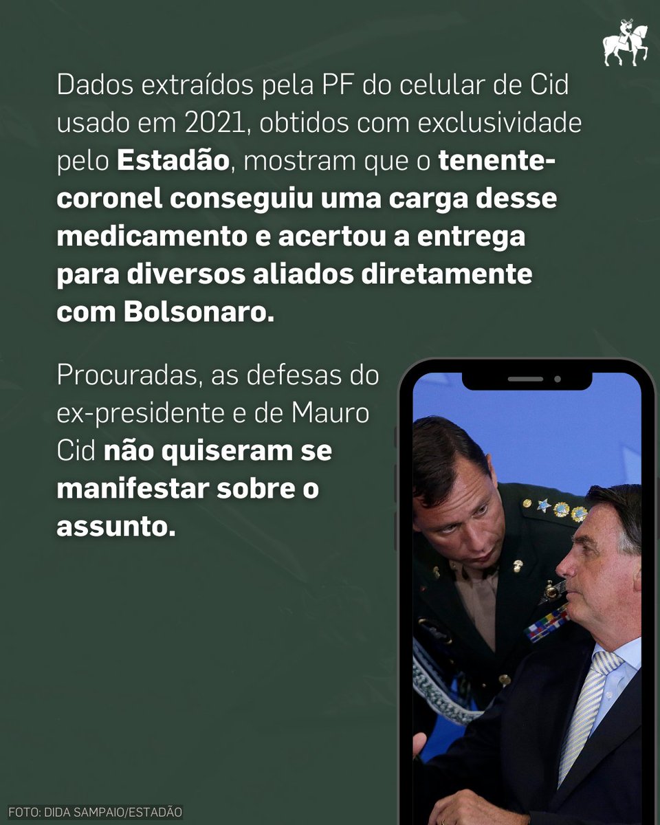 Dados extraídos do celular de Cid pela PF e obtidos com exclusividade pelo Estadão, mostram as conversas do tenente-coronel sobre a carga do medicamento. Confira a seguir 🧶