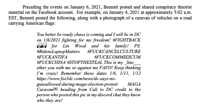Bennett's charging docs note this Facebook post from Jan. 4 that appears to offer insight into the variety of conspiracy theories and right-wing causes that motivated Bennett to go to DC, beyond the election