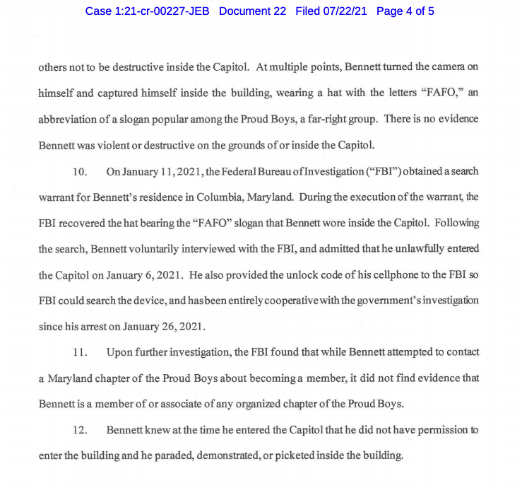 Plea docs are up for Andrew Bennett, and they incl. a notable addendum to charging docs — feds highlighted a hat he wore with "FAFO," a slogan associated w/ Proud Boys, and say he contacted a chapter about joining, but there's no evidence he actually did s3.documentcloud.org/documents/2101…