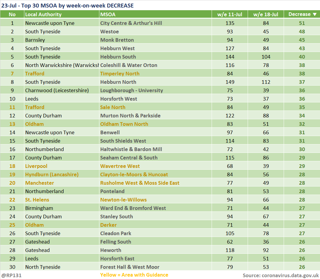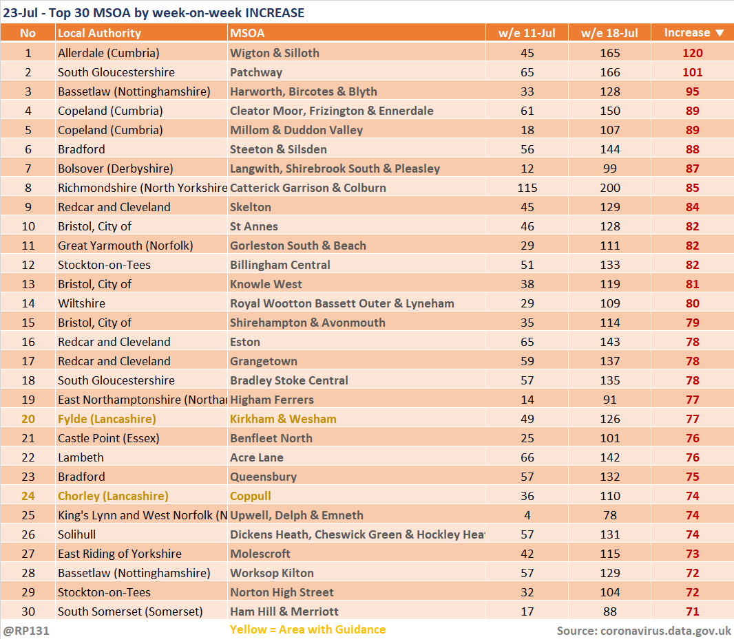 Updated (23-Jul) table of top 30 MSOAs (by rate) based on latest numbers in today's report.