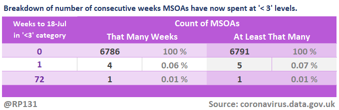 Bringing back the view of how many weeks the MSOAs have been in the suppressed 'less then 3 +ves in the last week' category. Since they don't allow us to distinguish between zero / 1 / 2, we generally consider it to mean zero. Link to full table in reply below.