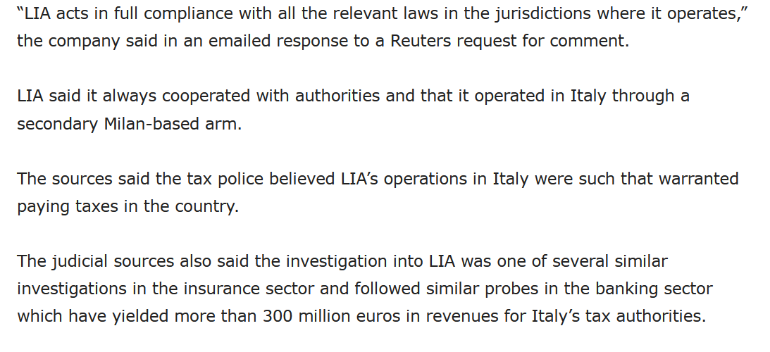 Looks like Italian tax police are looking across the insurance sector for similar examples of corruption. This follows success in finding tax evasion hidden by the banking industry.