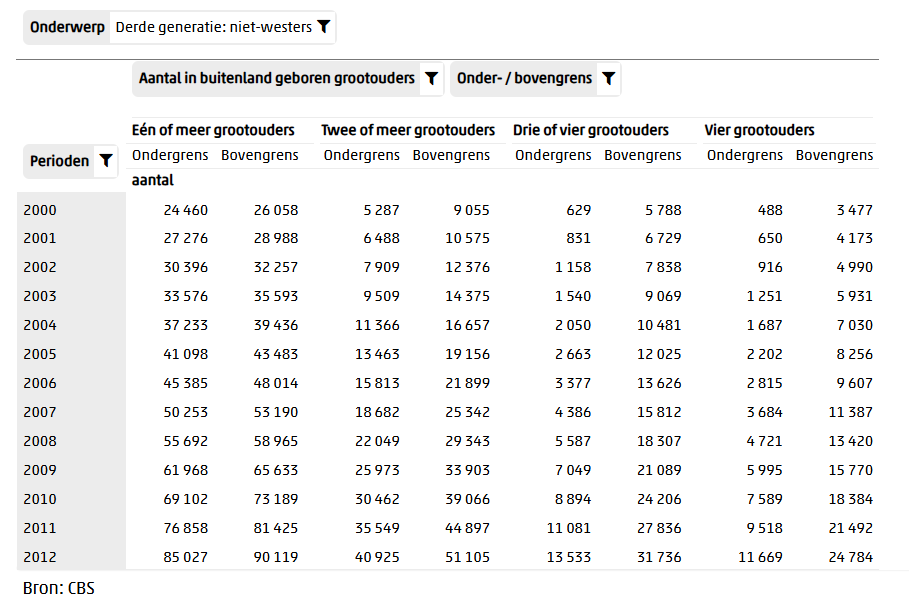 Feitelijk zou je voor een zuivere berekening van het effect van immigratie op de bevolkingsgroei ook nog de derde generatie in de berekening moeten betrekken. Daarover is echter te weinig informatie publiekelijk beschikbaar. Voor zover ik kan overzien krimpt de westerse derde generatie en groeit de niet-westerse derde generatie, waarbij er netto groei overblijft. Zelfs als je de daadwerkelijk de nettogroei zou kunnen vaststellen, ben je er nog niet, want je moet dan ook nog kijken hoeveel migranten-grootouders er zijn. Vroeger bestond er overigens wel een cbs-tabel die dat mogelijk zou maken👇maar die is stopgezet.
