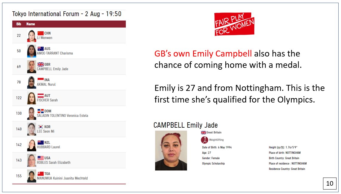 Great Britain has a good chance of a medal. Emily Campbell won the European Championships in April. She's good. But will she be good enough to beat Hubbard? /10