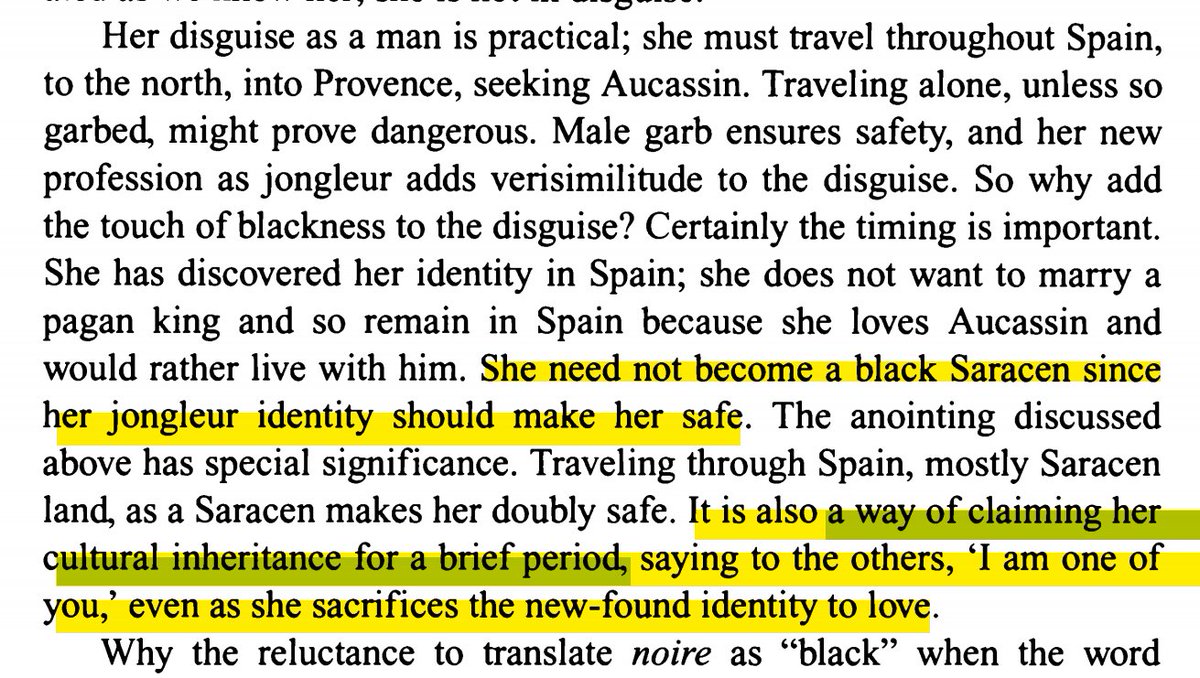Yet, De Weever argues we can read the moment differently. Nicolette is already in disguise as a male bard. She need not make herself "noire"