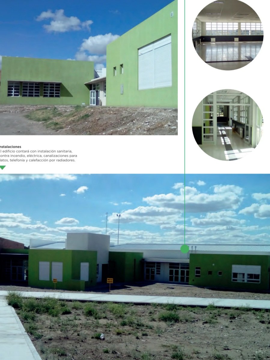 La obra se compone de muros de mampostería doble, ladrillo visto exterior, cubiertas generales de chapa, losas planas, aluminio en ventanas, puertas, marcos, hojas de chapas y cielorrasos de placa.
