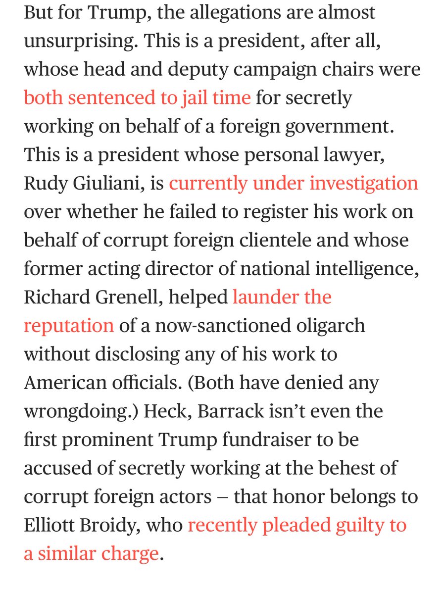 But tally Tom Barrack up as the latest in a long, long litany of figures close to Trump who secretly worked at the behest of corrupt foreign regimes, oligarchs, and dictatorships: