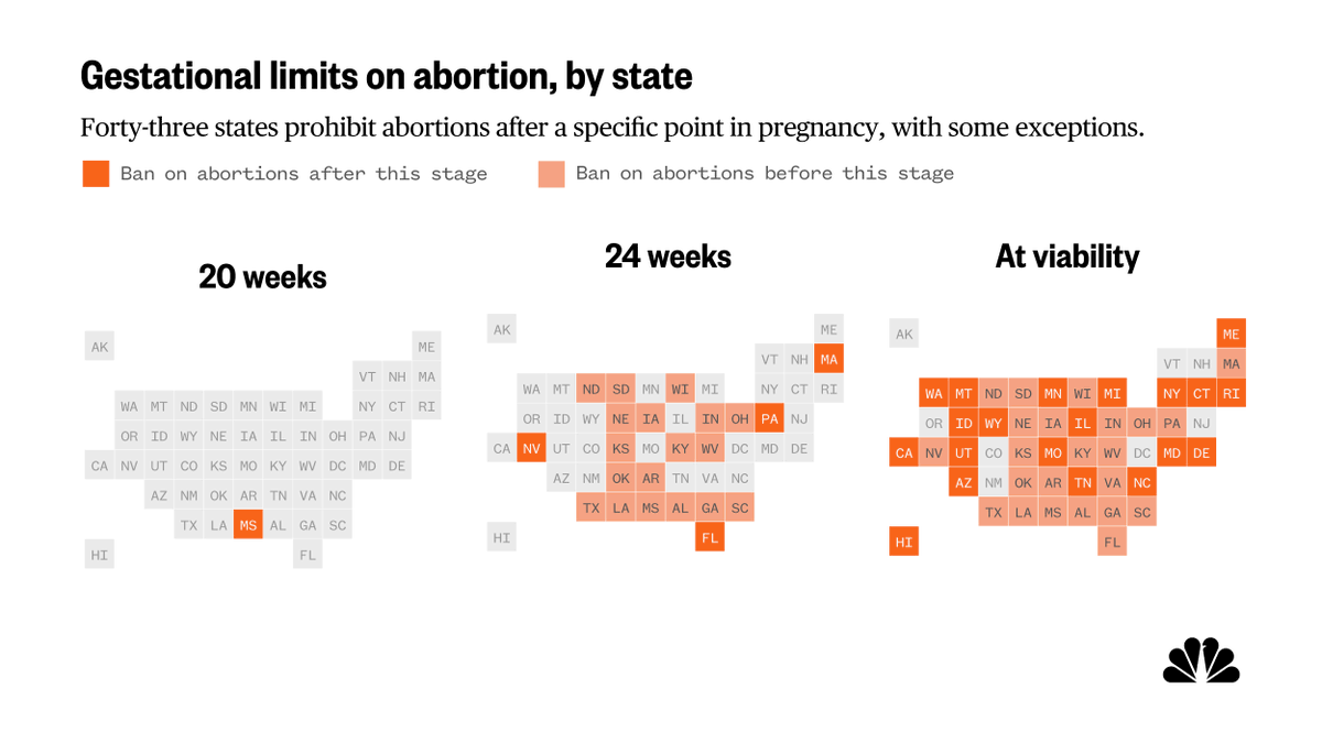 @chloe_aatkins Currently, 43 states cut off access to abortion at a certain point, unless the pregnant person’s life is in danger. However, 7 states and Washington, D.C., have no gestational age ban on the procedure. (7/8)